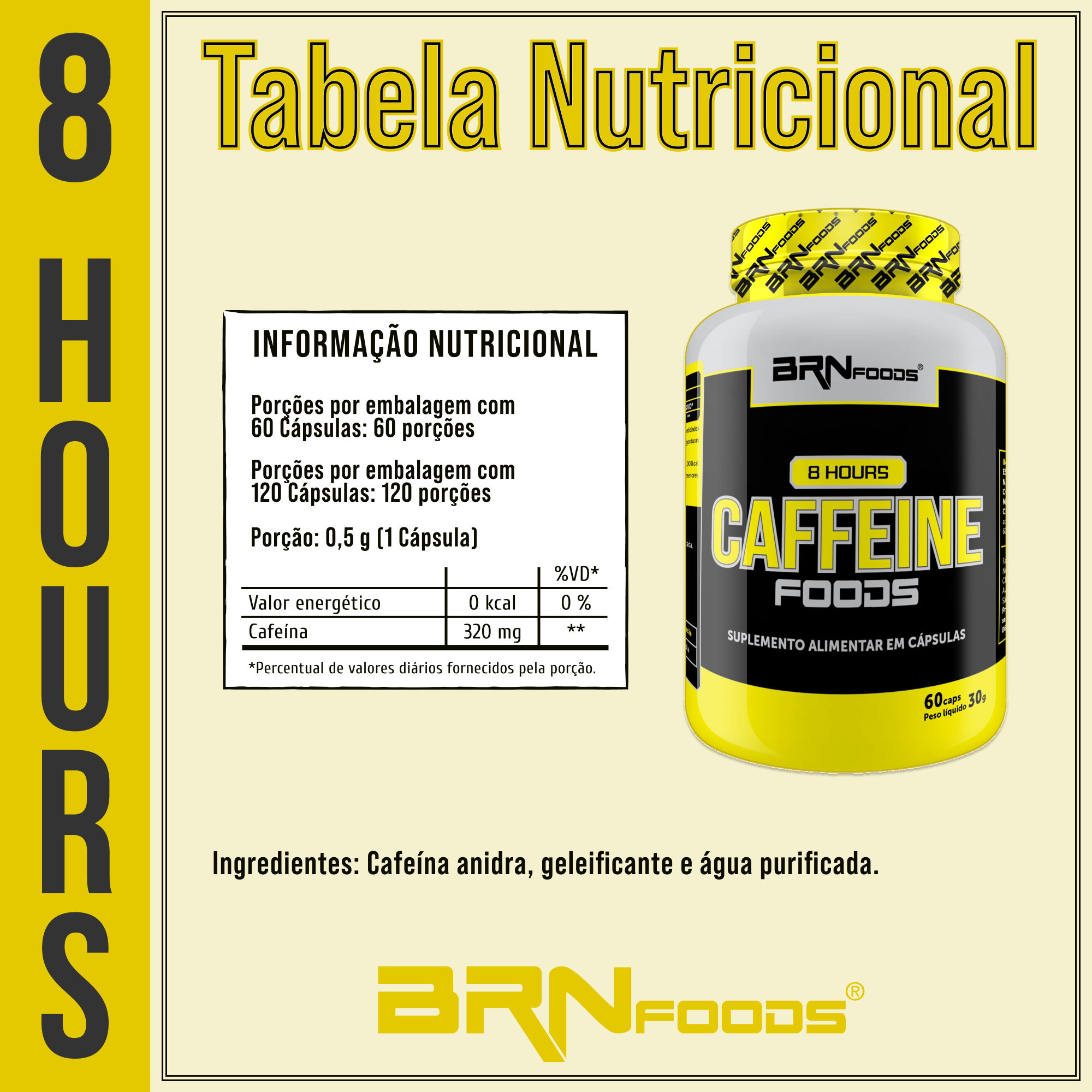 O 8 Hours Caffeine é um suplemento formulado com cafeína anidra, uma forma concentrada e de rápida absorção da cafeína.