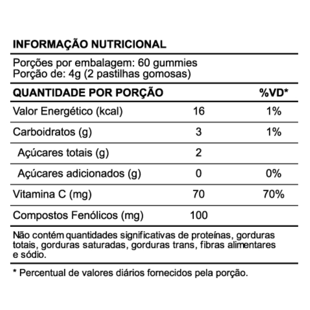 Cada porção de 2 gummies fornece vitamina C e compostos fenólicos provenientes do própolis, podendo ser facilmente incorporado à rotina alimentar.
