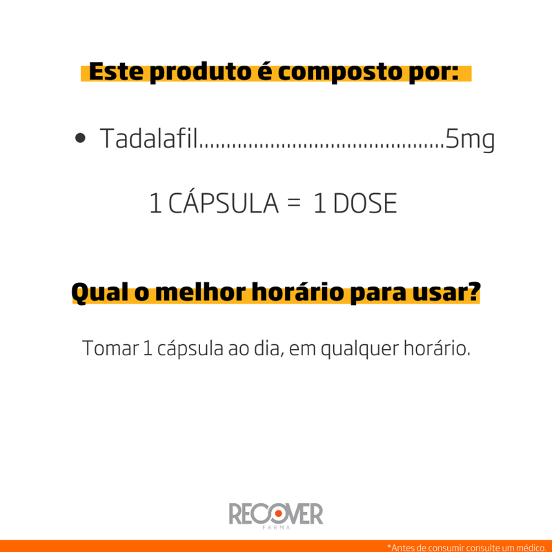 Para disfunção erétil, o efeito pode ser percebido a partir de 30 minutos após a dose, com duração de até 36 horas. No tratamento da HPB, nos sintomas urinários pode ser notada após algumas semanas de uso contínuo, conforme orientação médica. Os resultados variam individualmente.