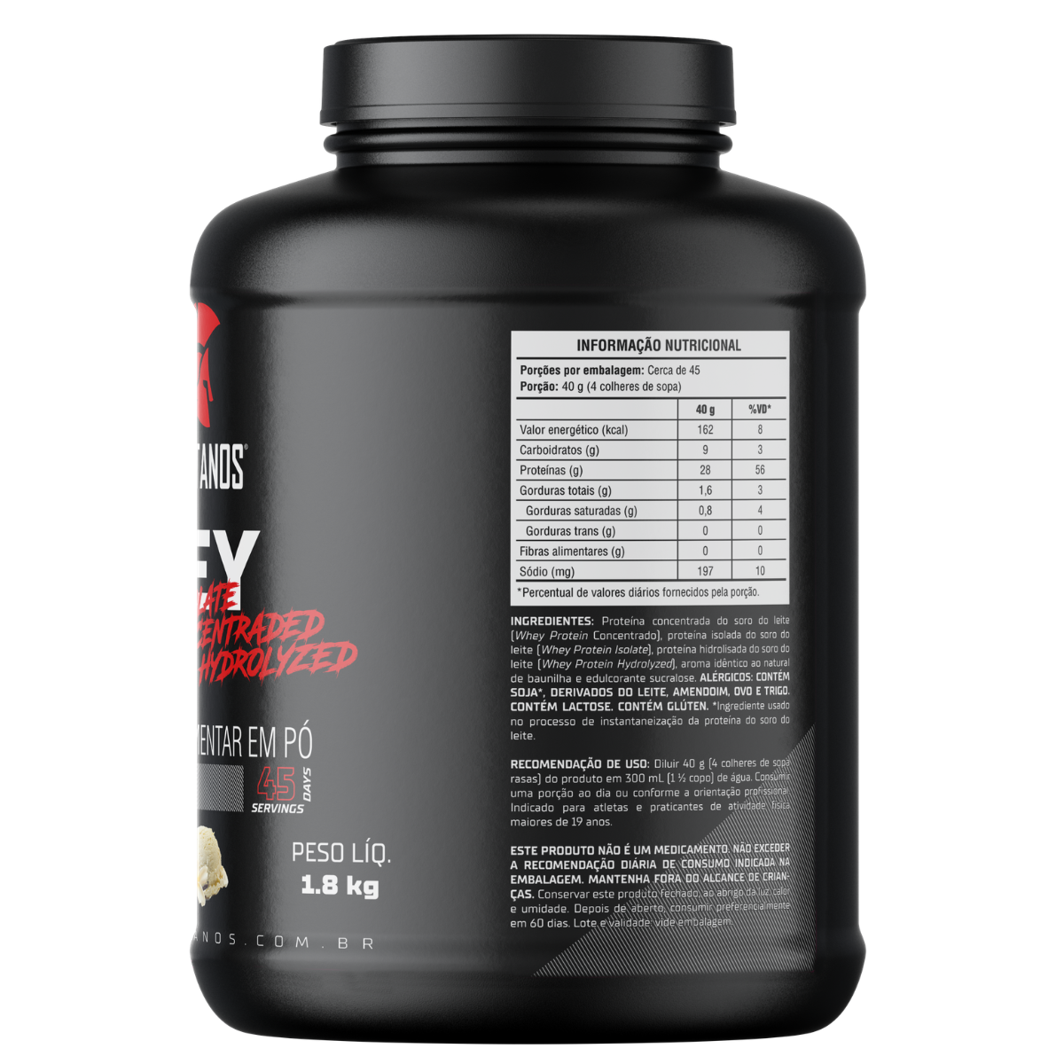 Sua fórmula combina três tipos de whey protein: concentrado (WPC), isolado (WPI) e hidrolisado (WPH), proporcionando uma composição versátil para diferentes rotinas alimentares.